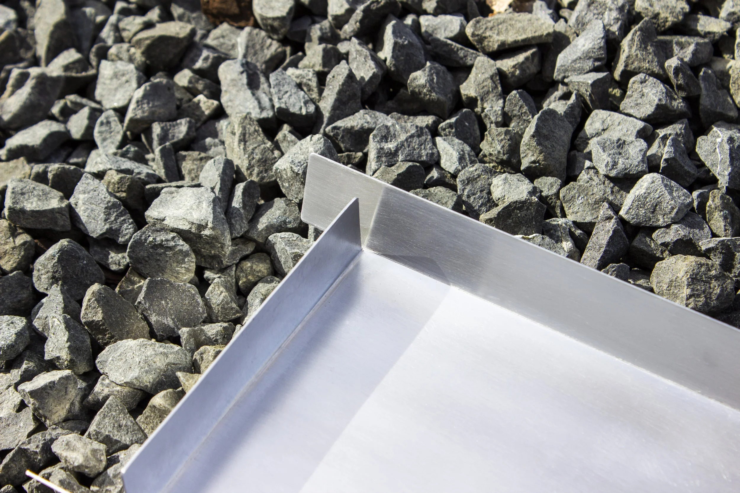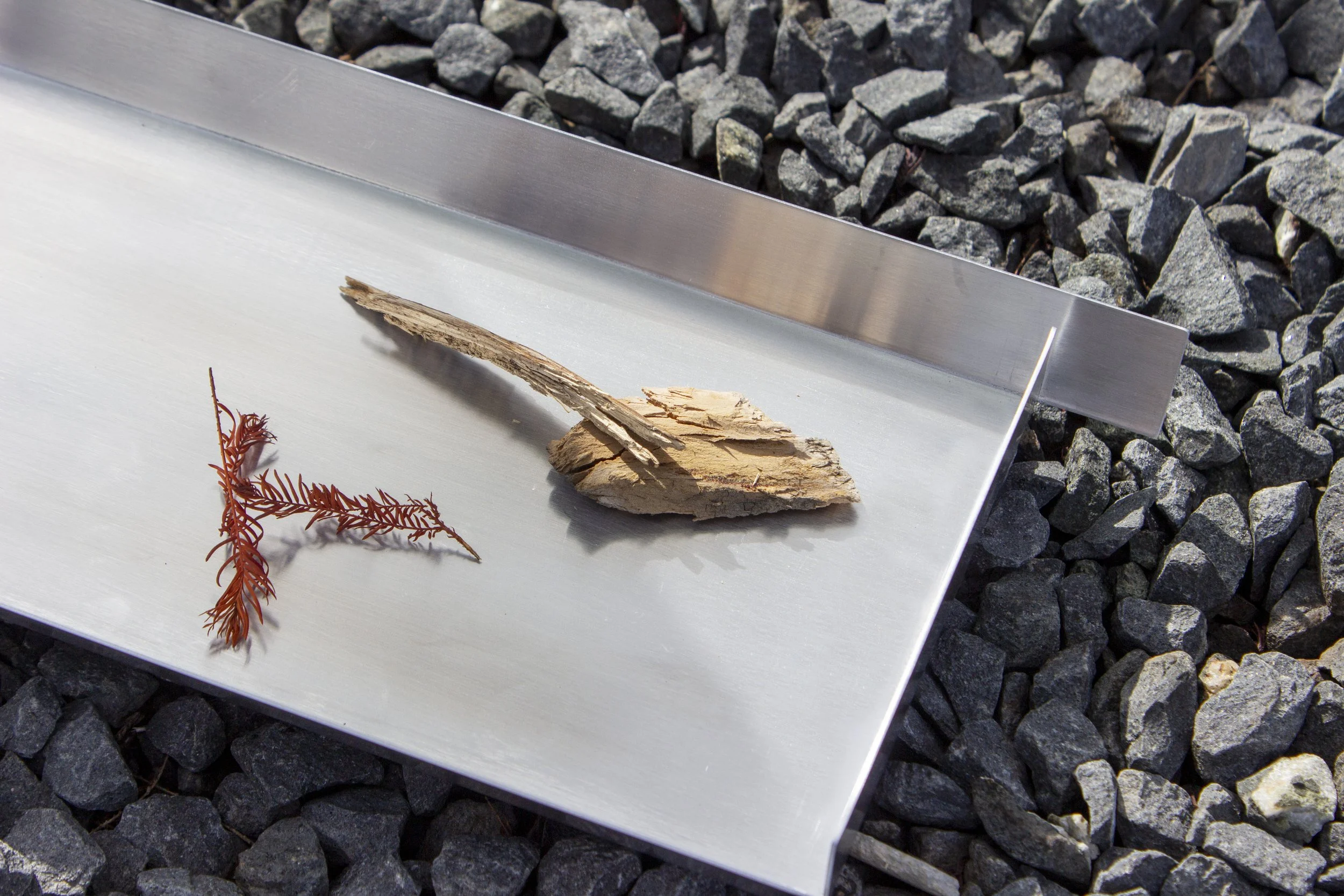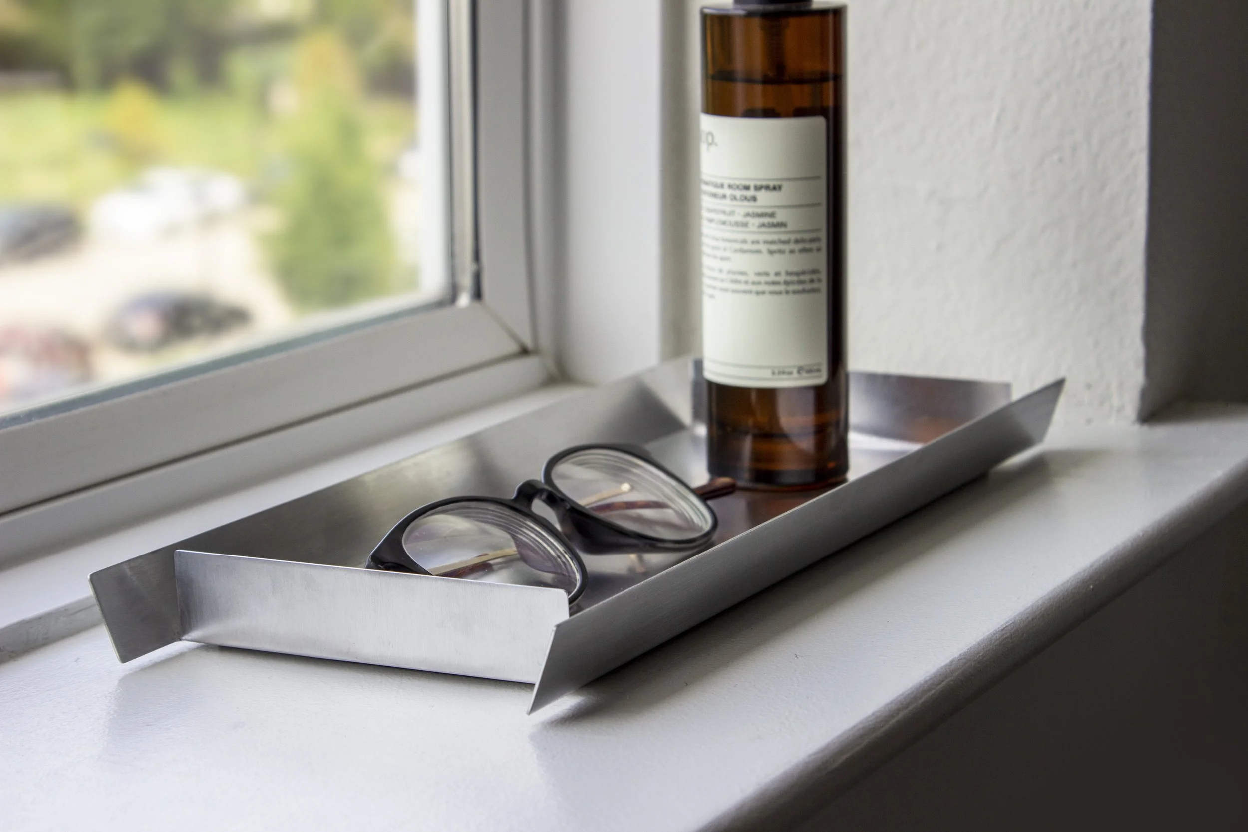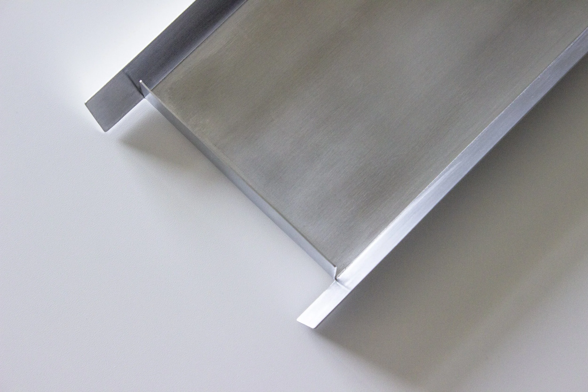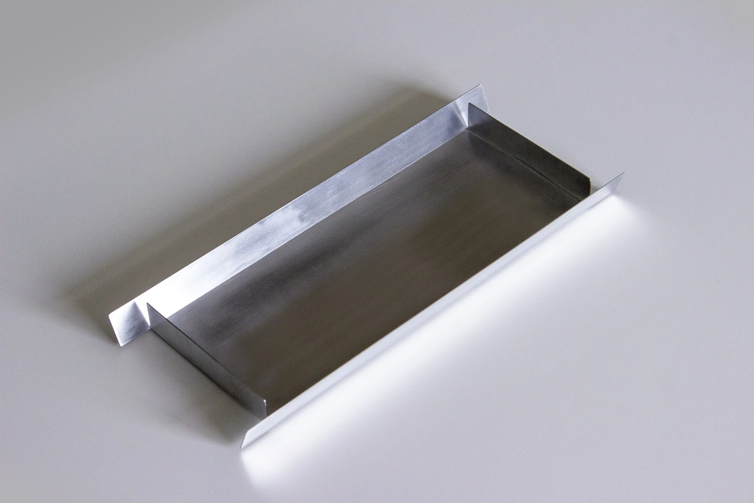 It is hand-crafted from a single 6"x12" aluminum sheet. The flanges on the long side are bent to 60° to create an inviting gesture for users to place objects inside the tray. The short flanges serve solely as a means of confining objects to the tray, so they are bent to an ordinary 90°.